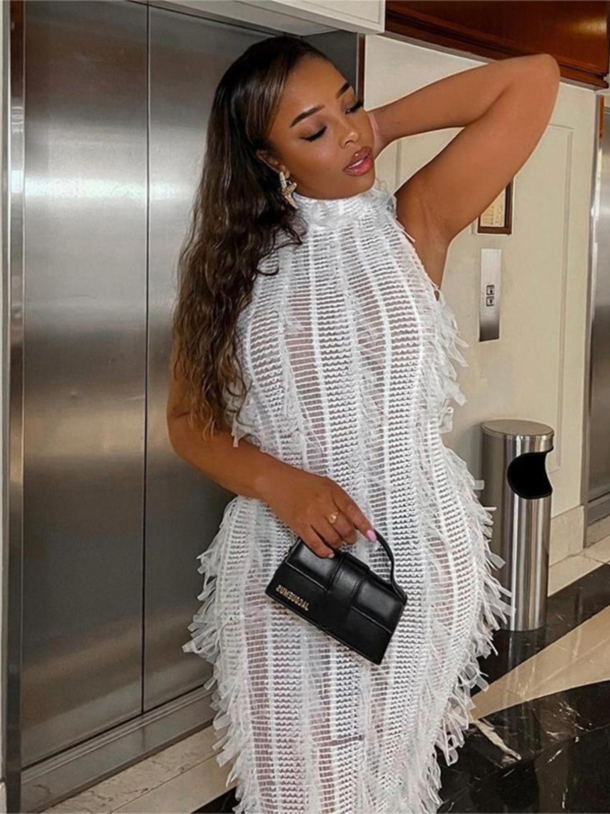 4.Adorned with charming tassels, the dress sways with every movement, adding a playful and flirty element.